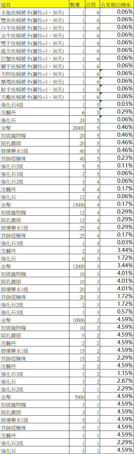 獎勵按照1-6品質組成12個獎勵,並按照機率出在占星獎勵中