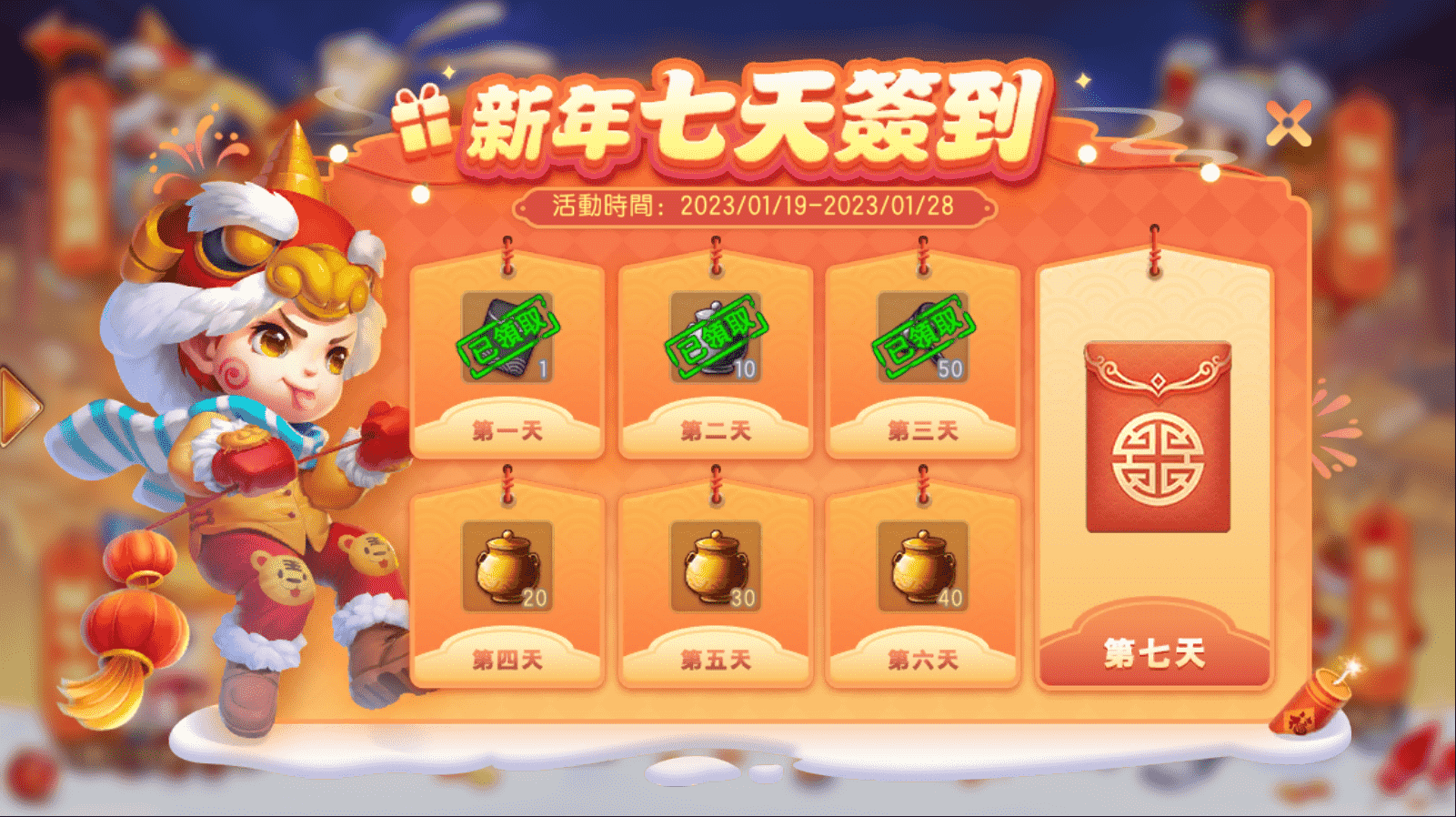 新年簽到一共有七天的獎勵,活動總時長為10天,簽到刷新時間為每日5點