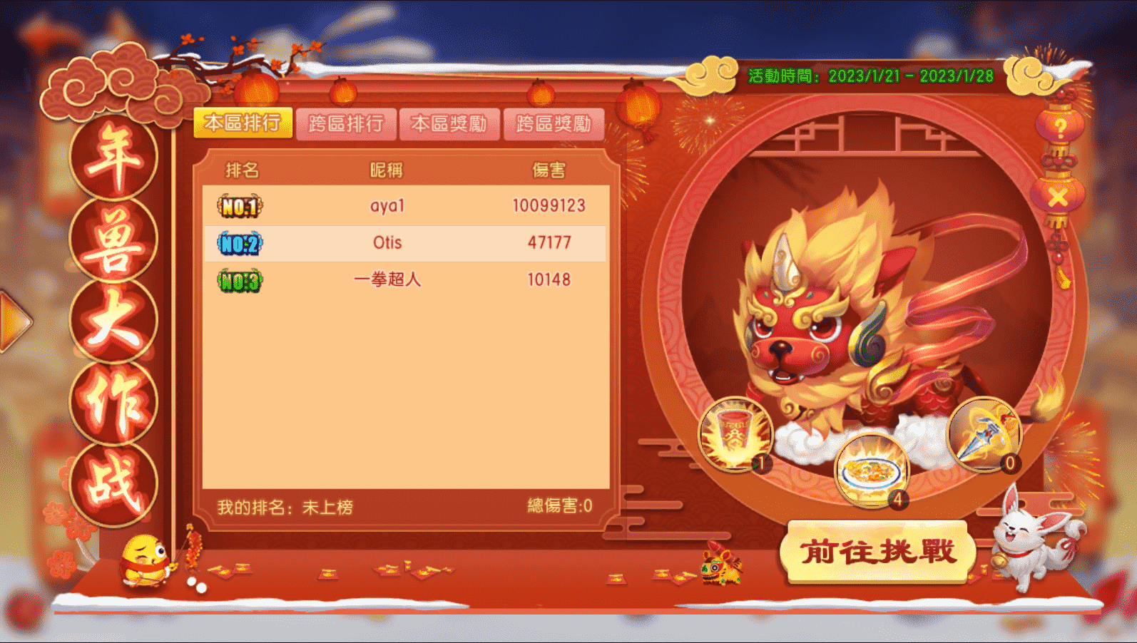 活動為跨服活動,BOSS年獸血量全服共享,玩家可於活動期間每天22:00:00~22:30:00挑戰年獸(年獸前5分鐘不扣除血量)
