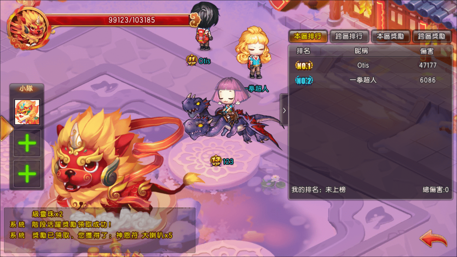 排行榜:排行榜分本區排行榜及跨區排行榜,根據玩家至活動結束時累計本區傷害前100名發放排行獎勵,若傷害一致則取到達傷害時間的先後,時間先者排行靠前;排行每日重置,獎勵每日經郵件發放