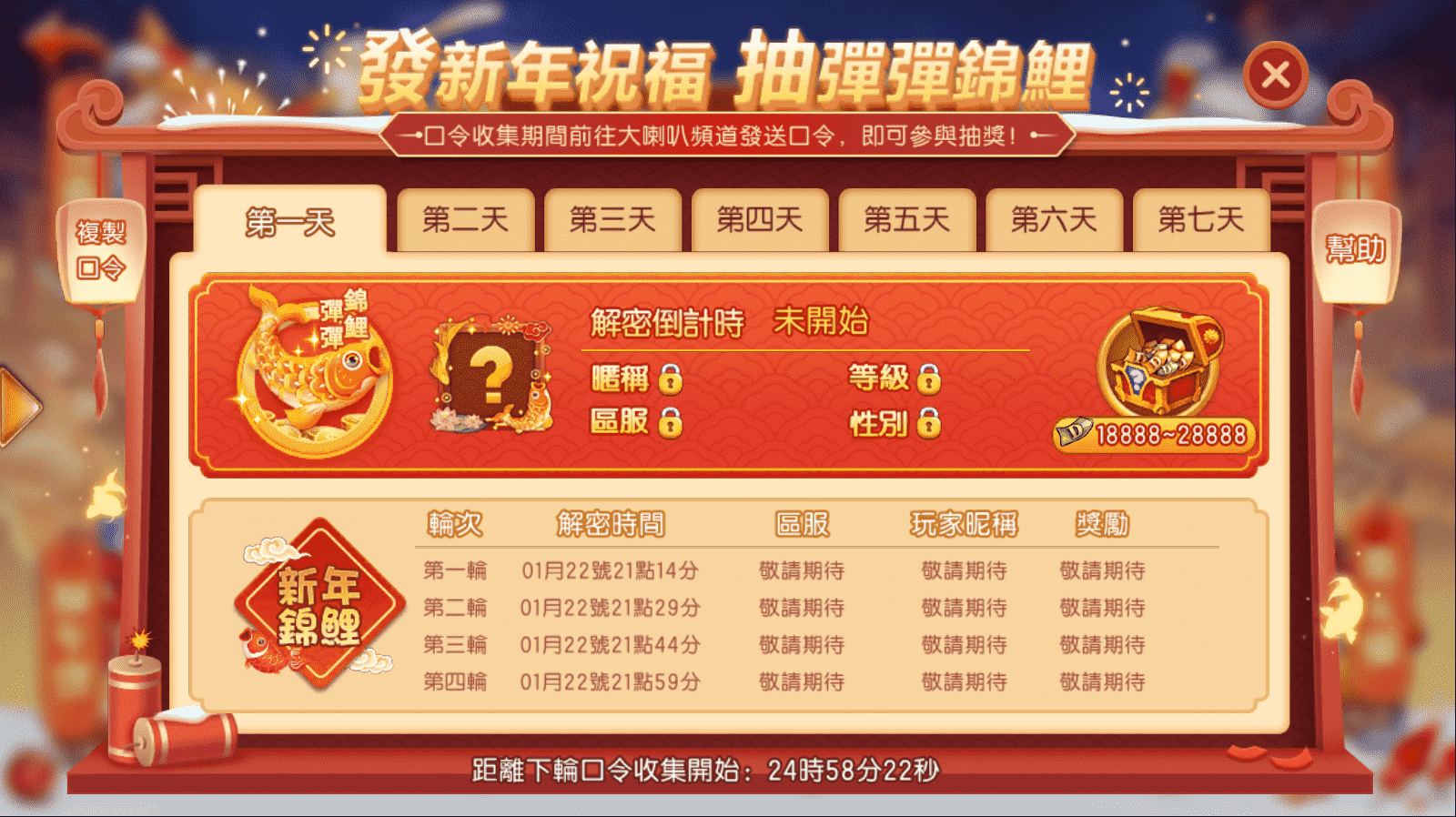2.每小輪持續15分鐘,前13分鐘玩家可通過發送口令參與該輪抽獎,第14分鐘公布該輪的"新年錦鯉"(未發送口令則未參與本輪抽獎)