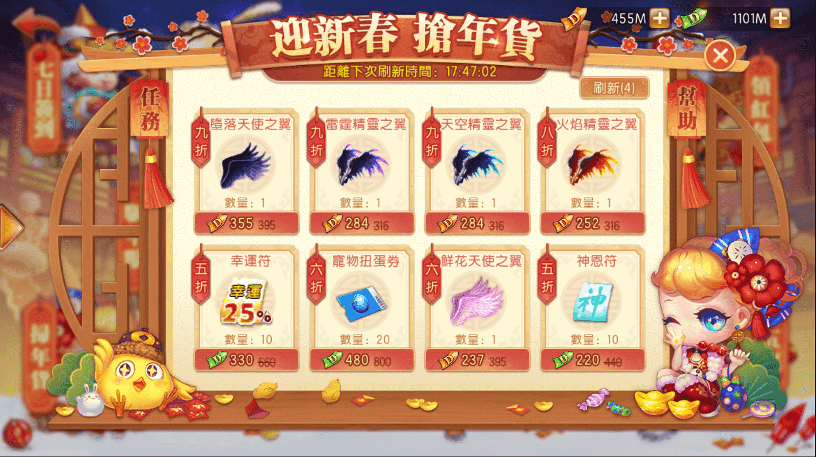 春節活動分幾個大項,七日簽到、領紅包、年獸大作戰、掃年貨、抽錦鯉、天使魔罐、財神到、集五福