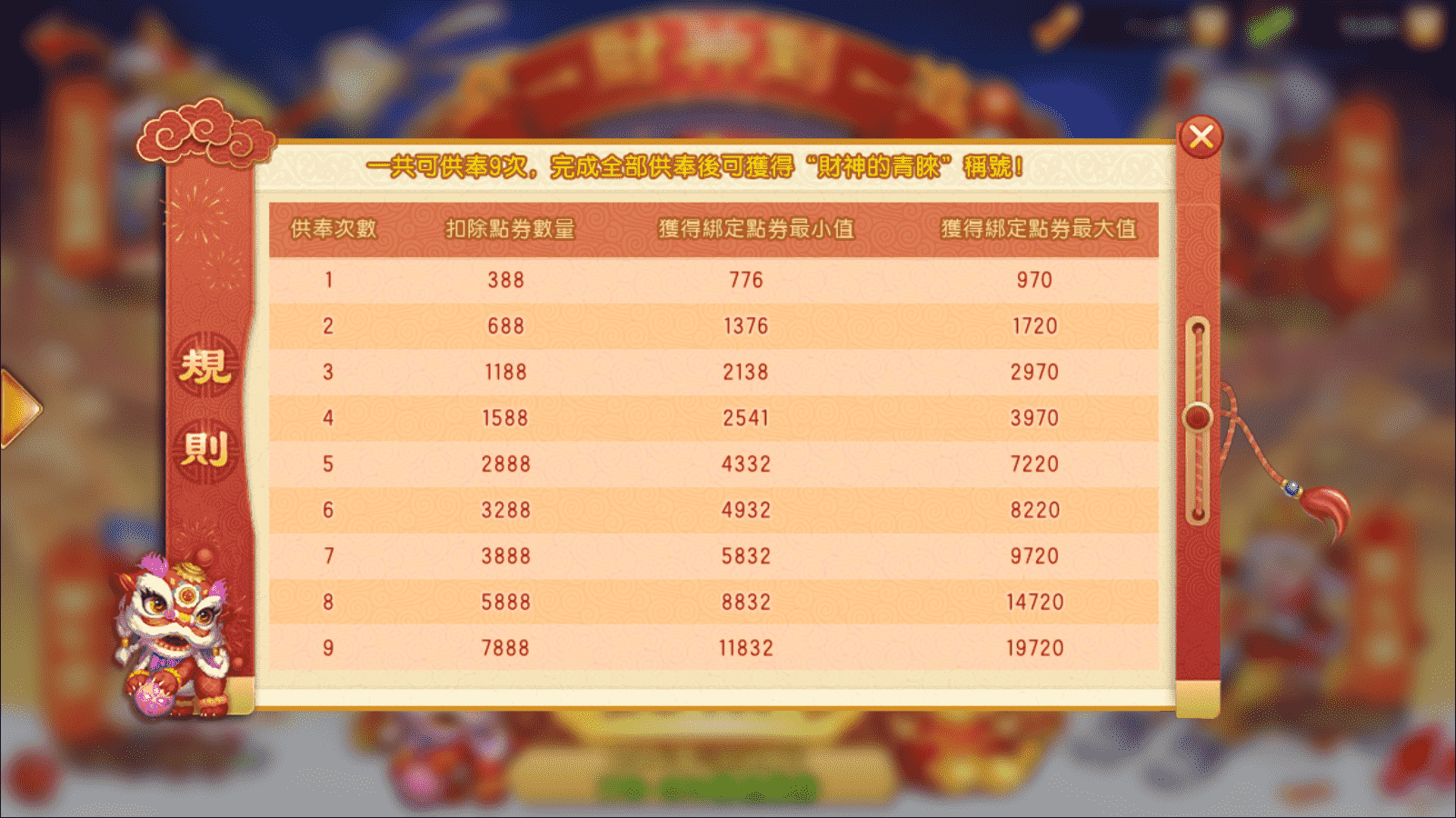 隨著供奉的次數增加,每次所需要的點券和獲得的綁定點券也逐漸增多