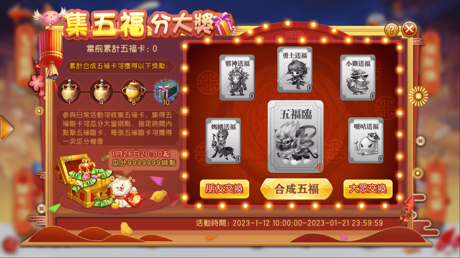 玩家須湊齊五張不同的福卡並進行合成,累計合成五福卡可獲得合成獎勵