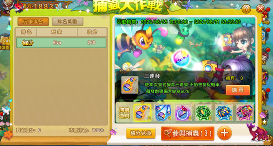 活動結束後將無法遊玩,僅顯示排行榜及供積分兌換(一日),請玩家勿再購買捕蟲道具。