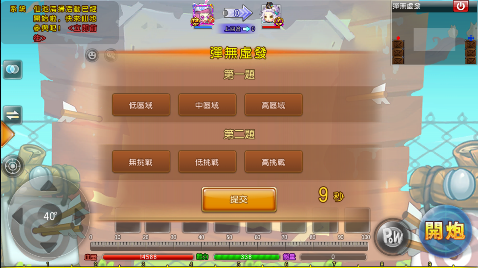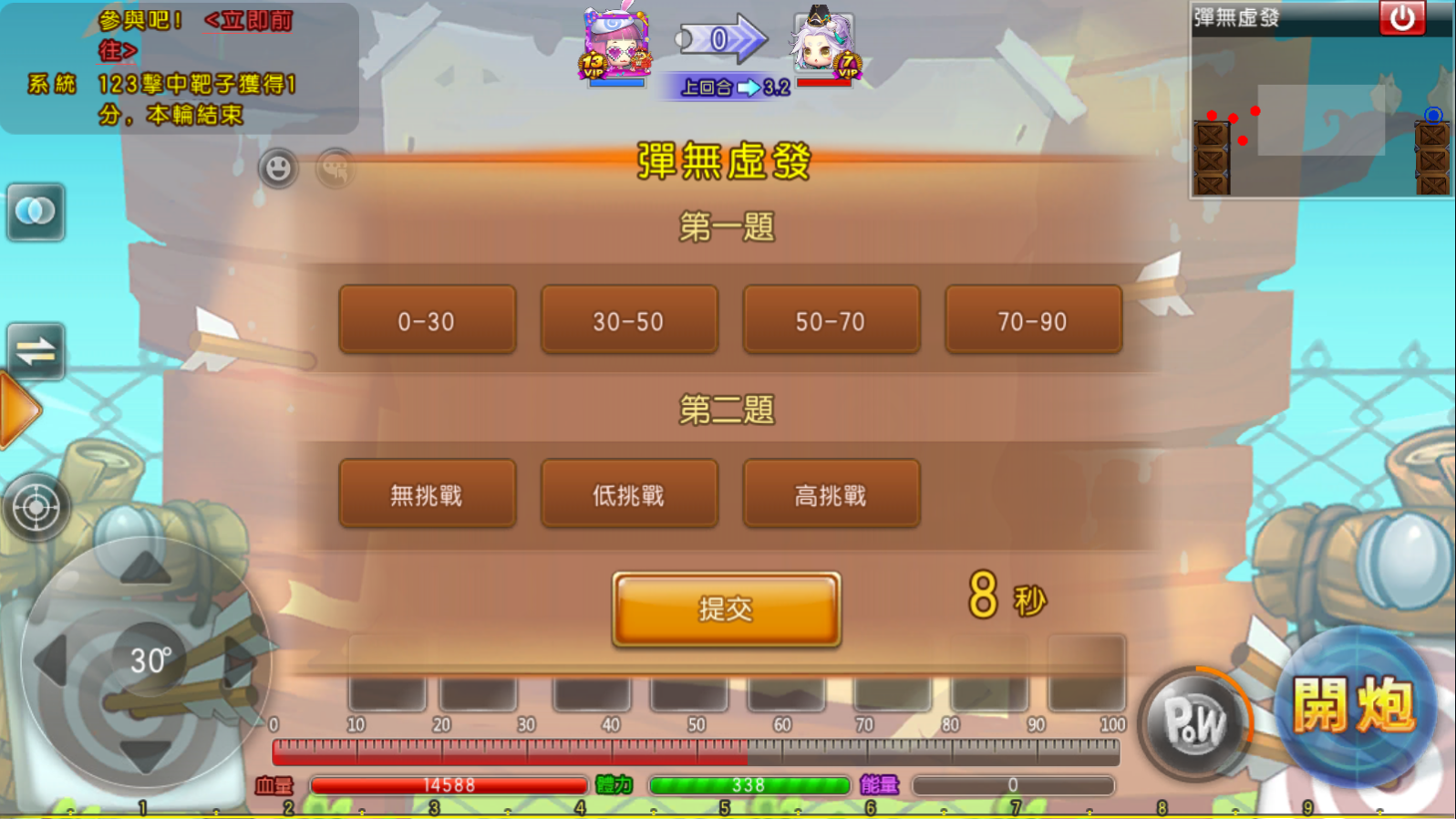 - 比賽由多輪對決組成,每輪對決將由雙方決定靶子的出現區域以及砲彈的發射角度(做出的選擇對雙方生效),率先打中靶子的玩家獲得1分,結束這一輪對決,每一輪對決雙方各自最多有3次出手機會