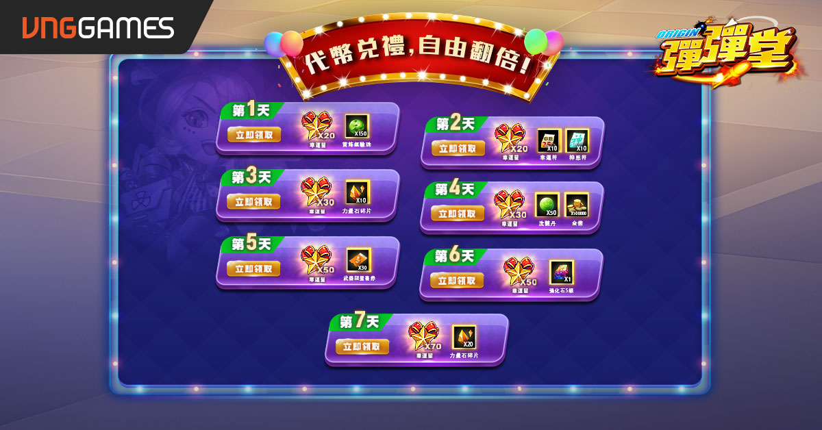春季尾聲最盛大慶典彈彈年華即將開跑!網頁簽到活動為 2024 年 4 月 25 日至 2024 年 5 月 8 日 止,獎勵將在成功簽到後直接匯入遊戲內部信箱;此次簽到獎勵包含了限定道具「幸運星」可讓玩家自行分配數量兌換此次慶典專屬紀念套裝、翅膀、強化道具等多項好禮,並且每日給予的豐富贈禮都不盡相同,從第一日的「幸運星*20 和 首飾經驗珠*150」到第七日的「幸運星*70 和 力量石碎片*20」,獎勵價值會隨著累積簽到天數日漸提升,彈友們記得天天簽到以獲取更多虛寶!