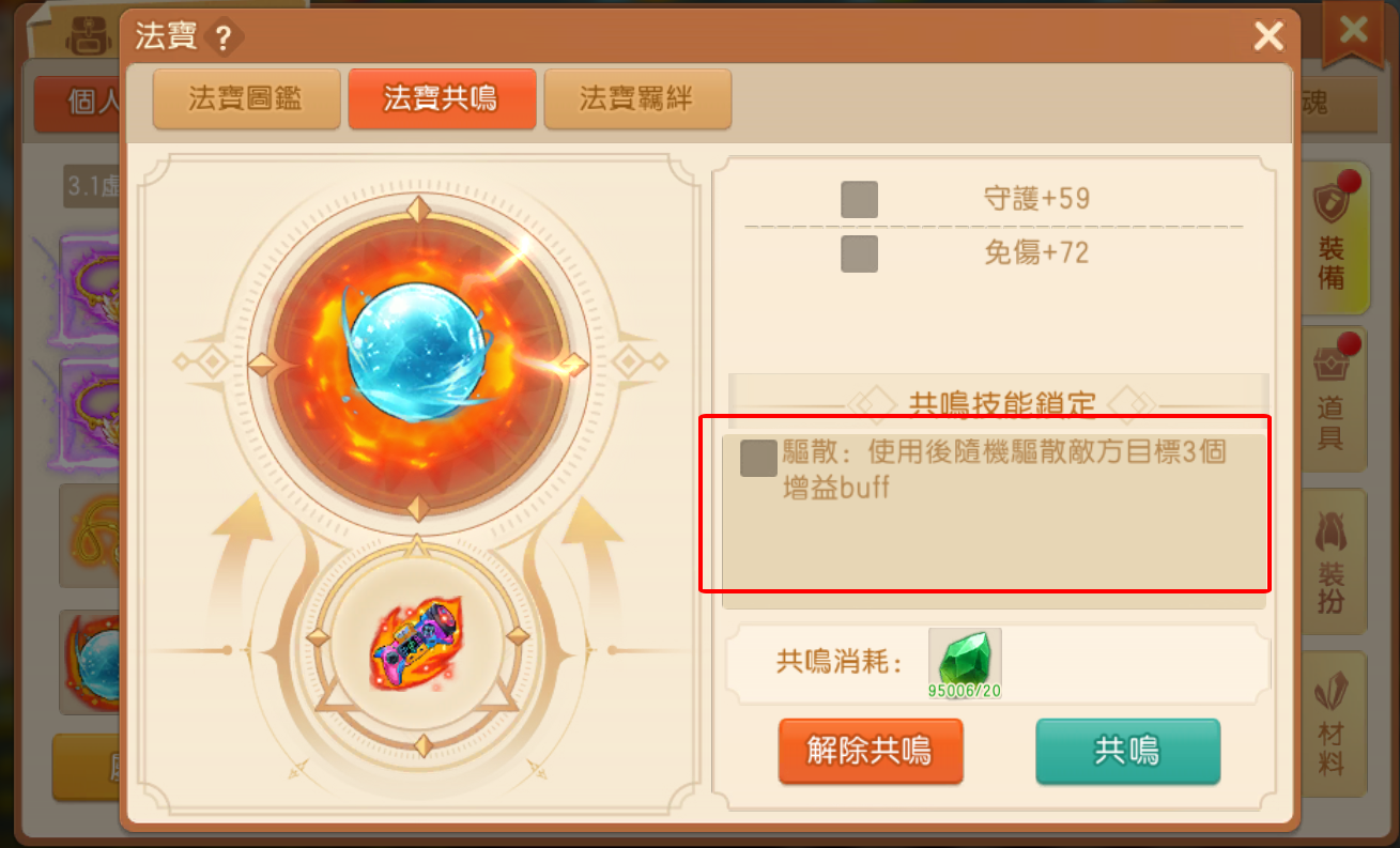獲得法寶後須與對應武器進行共鳴,共鳴可機率刷出技能及屬性磁條,法寶、武器品質越高,刷出磁條數量越多(最多四種)