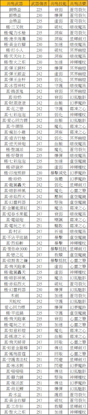 各位彈友好,這邊為法寶介紹及各武器共鳴技能,可依此公告對照,往後更新武器將於此公告更新表單
