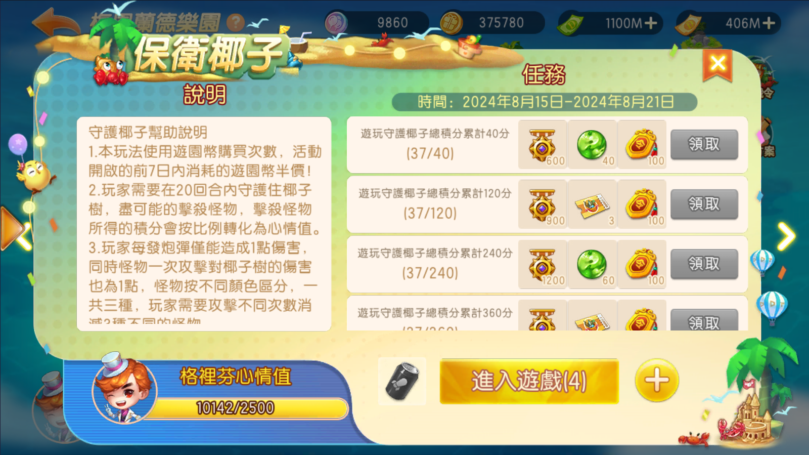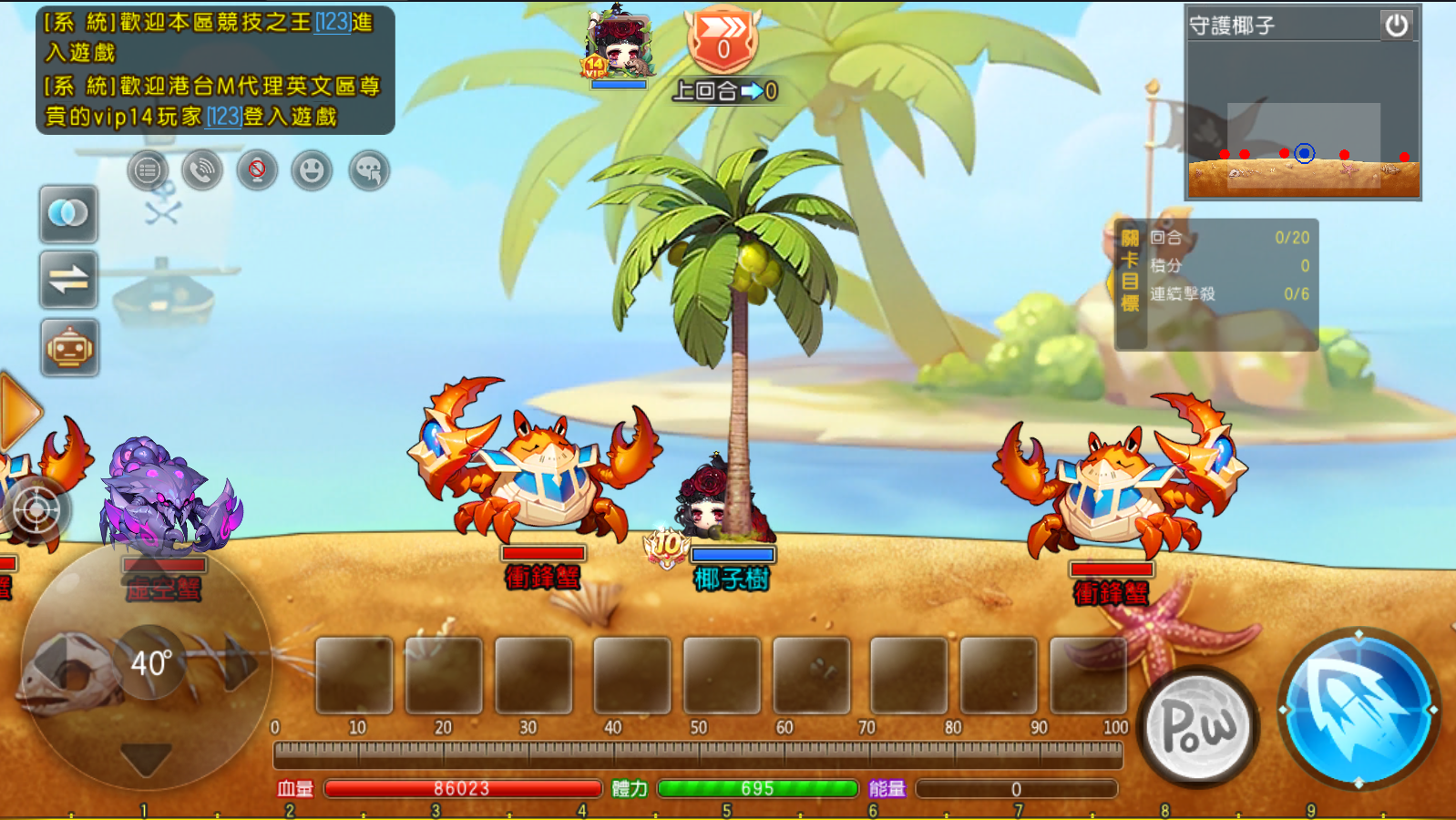 2.玩家需要在20回合內守護住椰子樹,盡可能的擊殺怪物,擊殺怪物所得的積分會按比例轉化為心情值。