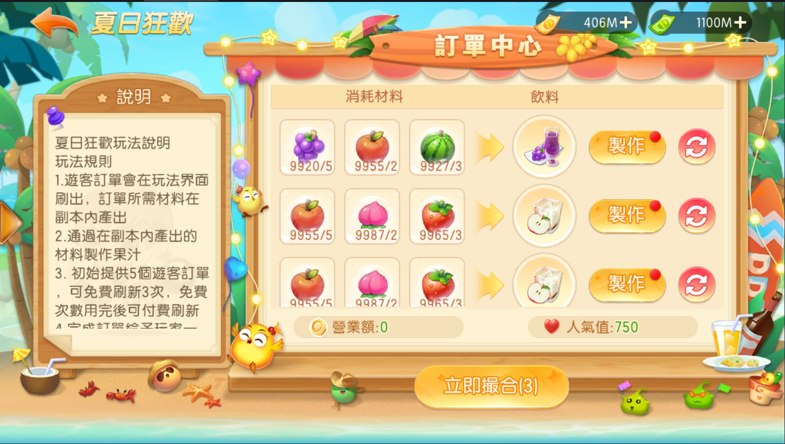 5.特殊道具夏日飲料(進入玩法前購買):連擊效果增加為5回合