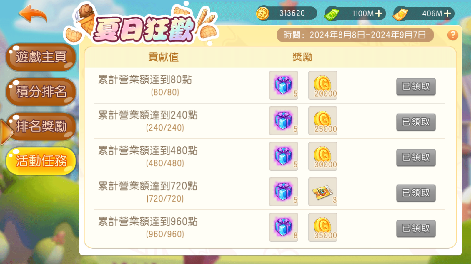 3.總積分計算:玩家參與夏日狂歡活動獲得的營業額以及其他玩法獲得的格裡芬心情值