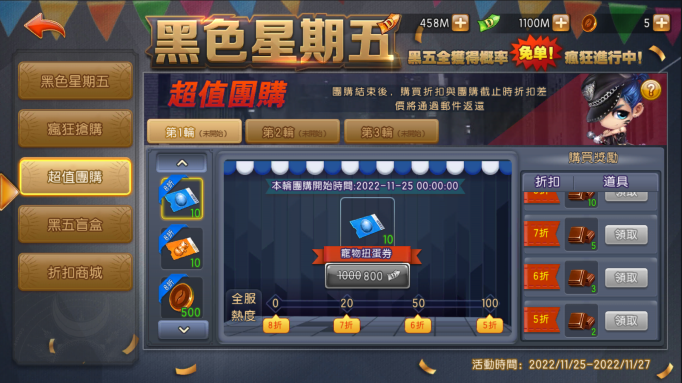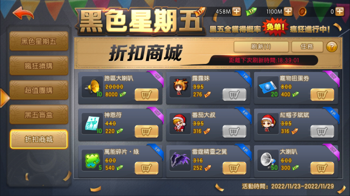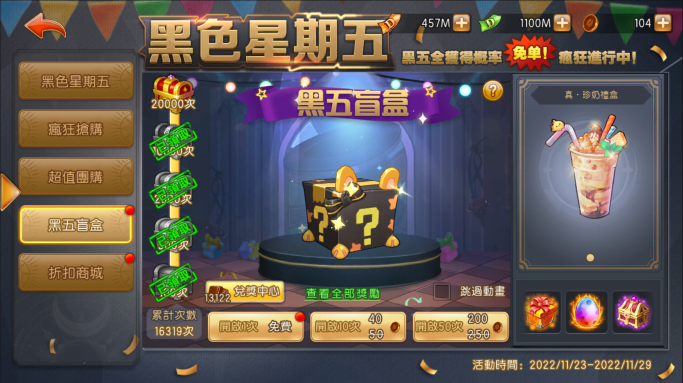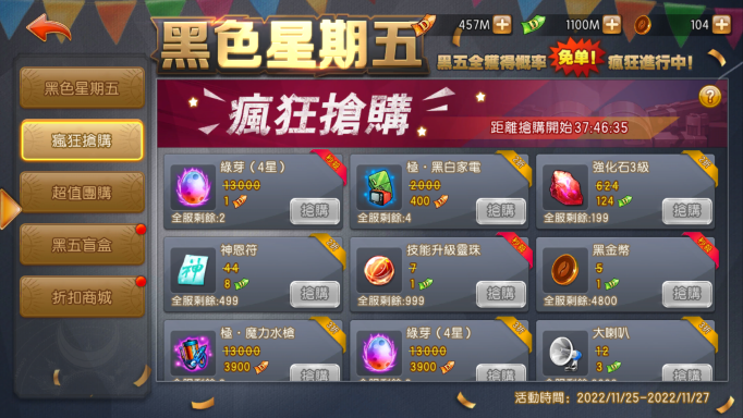 - 活動有五個大項:首儲雙倍重置、瘋狂搶購、超值團購、折扣商城、黑五盲盒