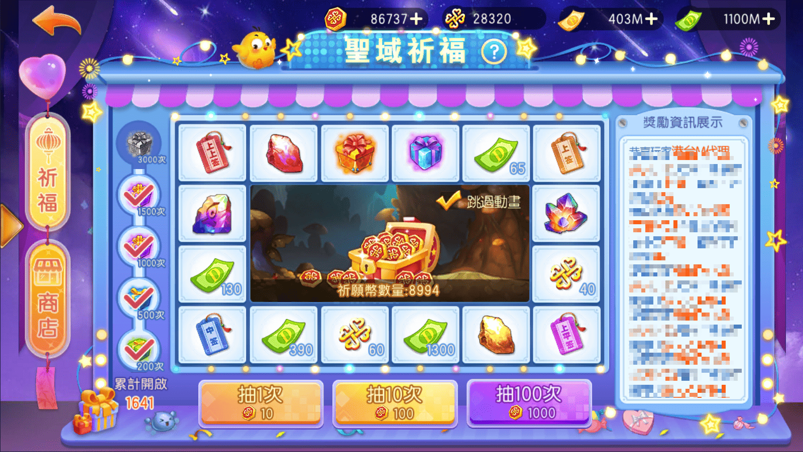 祈福:通過點券購買祈願幣進行祈福,10個祈願幣祈福一次