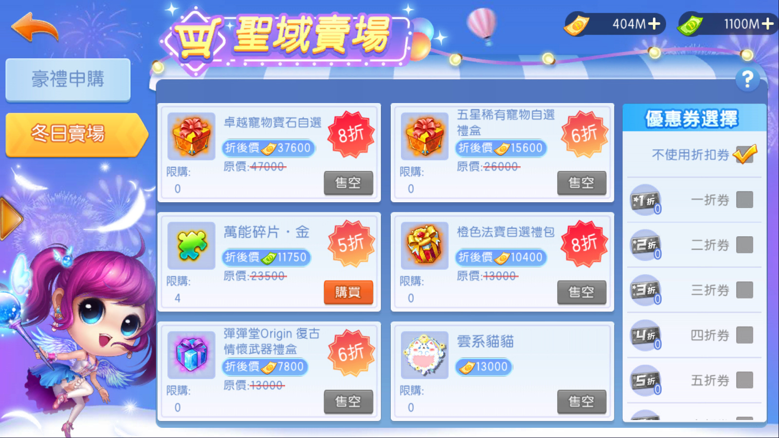 冬季賣場:可使用優惠券購買各項素材、泡泡、等個性化道具