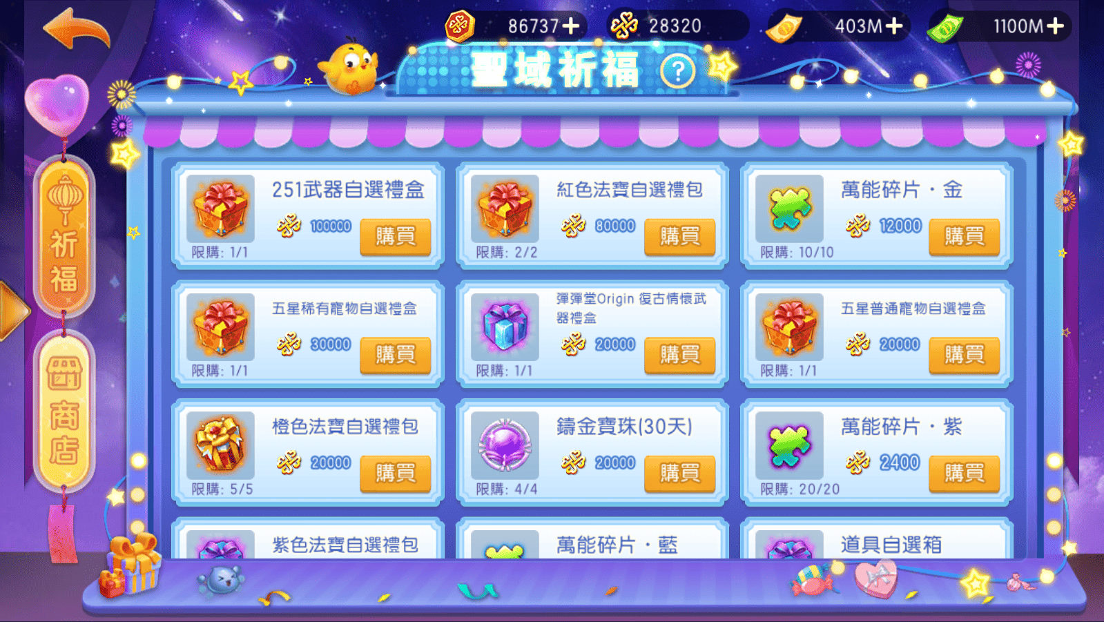 商店:可使用祈福獲得的祈願積分進行購買,各項好禮等著你