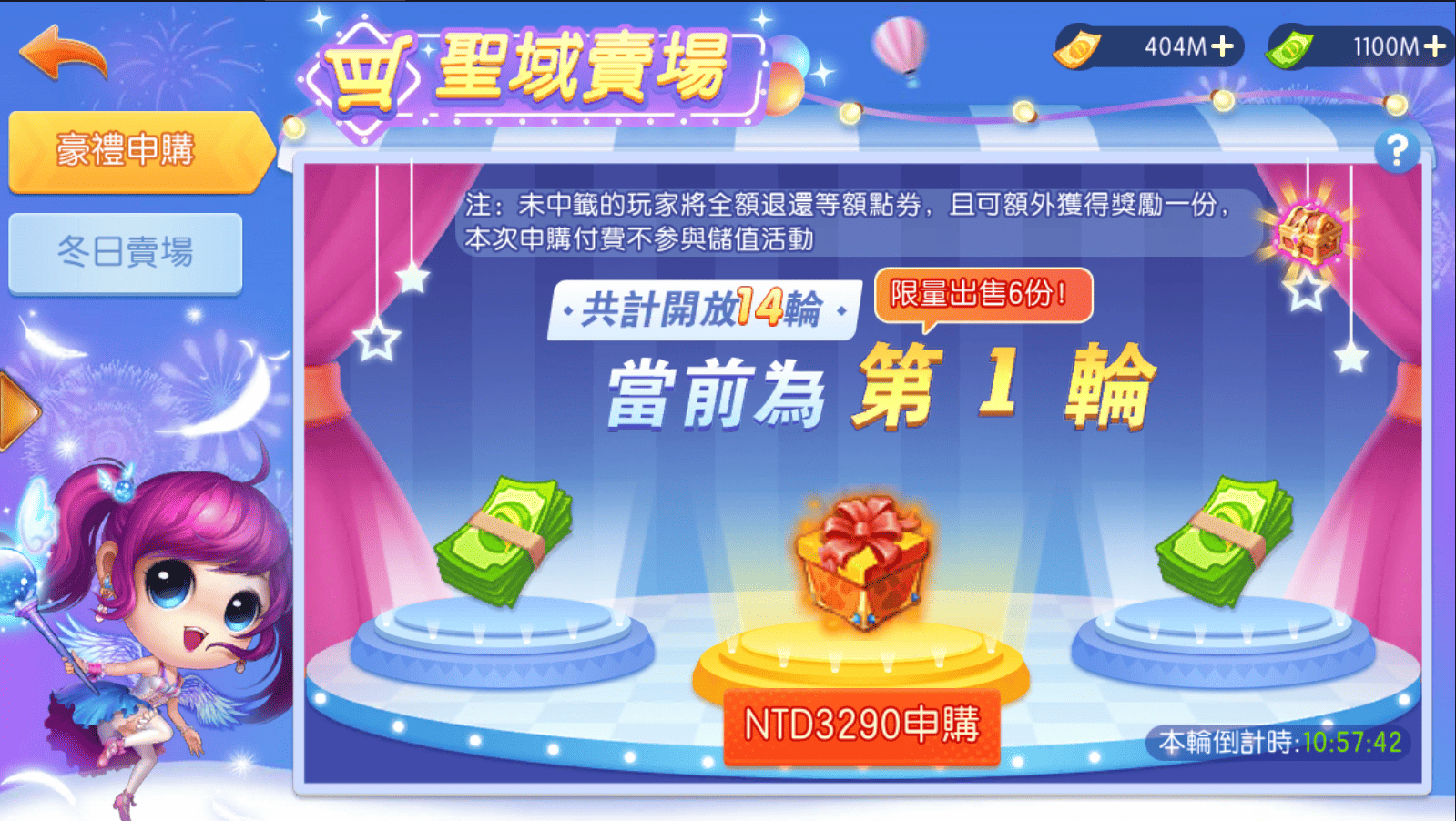 豪禮申購:每日開放新一輪直購獎勵,總共14輪,每日10:00開始申購,20:59進行結算,結算後10分鐘將於信件內發送申購獎勵