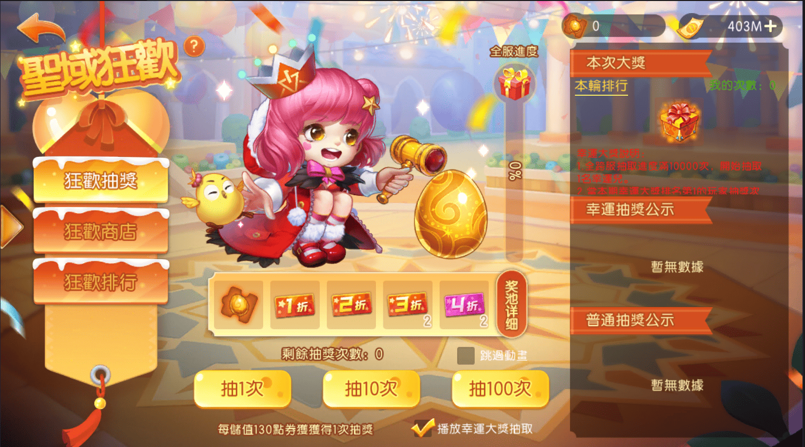 狂歡抽獎:使用抽獎券抽取兌換幣及優惠券,並可累積跨服抽獎進度,累計進度達成後即會抽出進度大獎