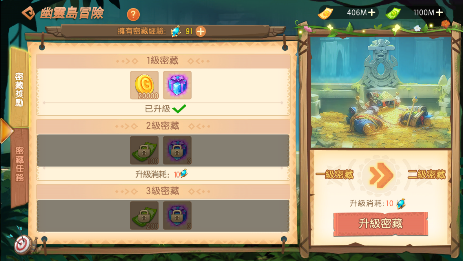 通過完成密藏任務或購買密藏經驗,開啟更高等級的密藏、獲得更好的獎勵