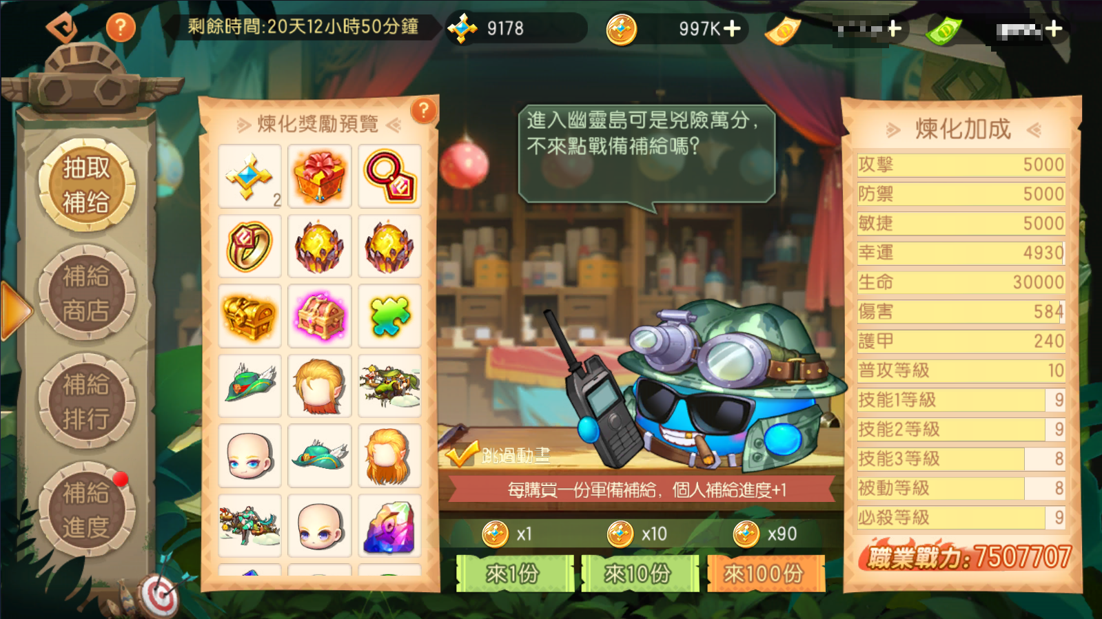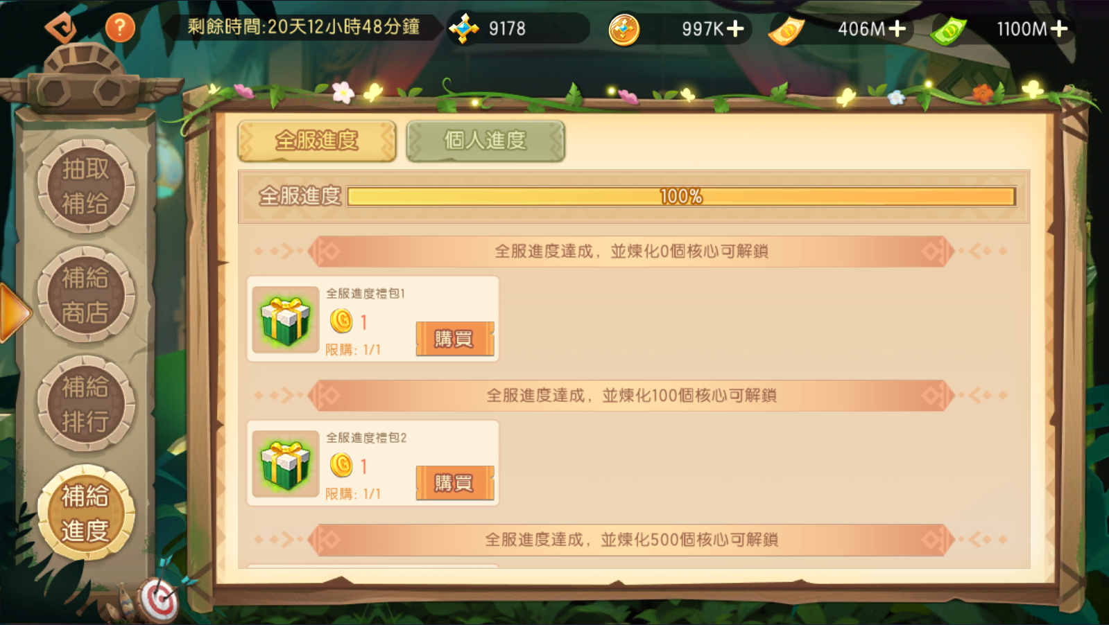 補給進度則分全服及個人的煉化次數,達一定次數則可用優惠價格購買商品及傭兵