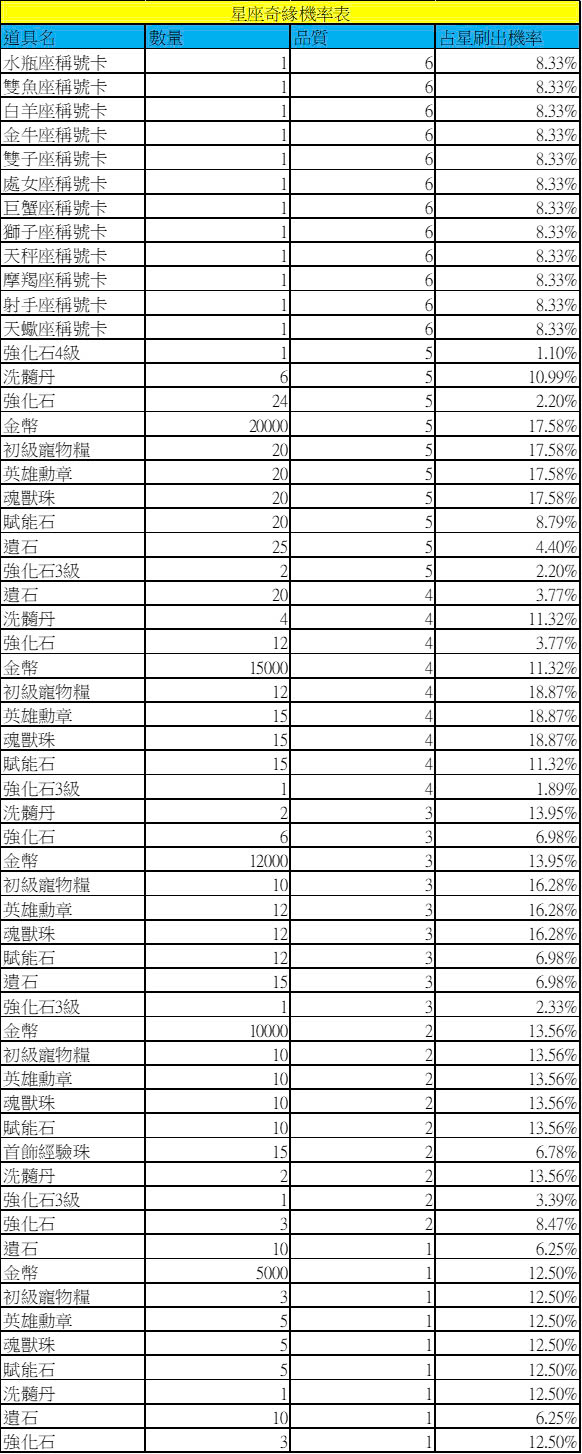獎勵按照1-6品質組成12個獎勵,並按照機率出在占星獎勵中