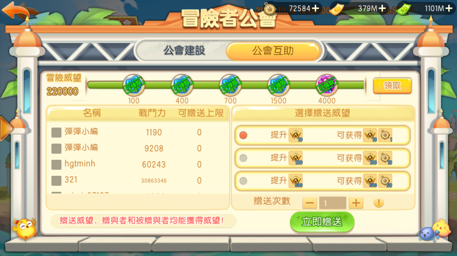 - 可選擇公會成員贈送威望,贈送威望需要花費相對應綁定點券/點券