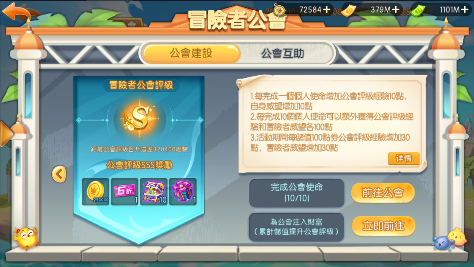 - 每完成一個個人使命增加公會評級10點經驗,自身威望增加10點