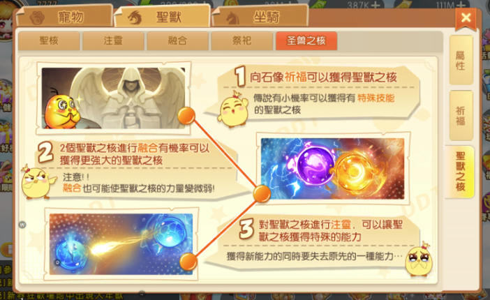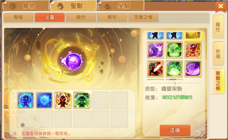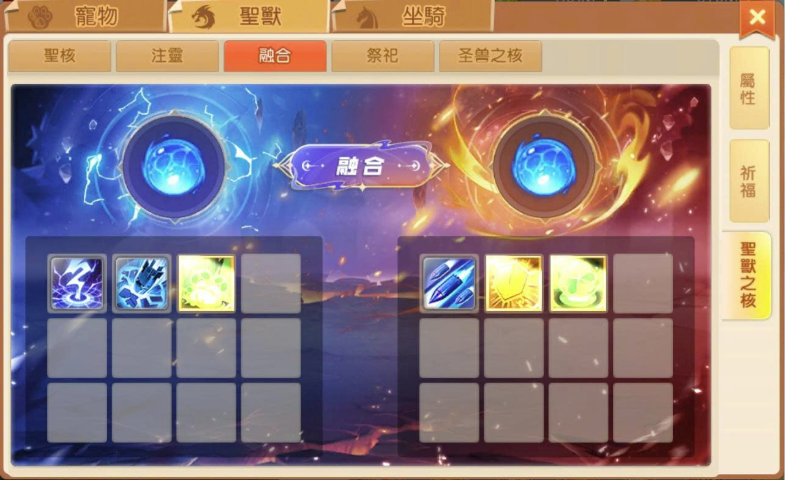 聖獸之核頁簽分為聖核、注靈、融合以及祭祀