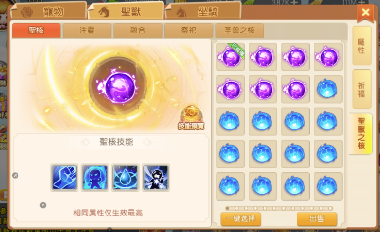 2. 聖核:可於聖核頁籤裝備獲得聖核,如該聖核中包含相同屬性的技能,將只生效屬性最高的技能。