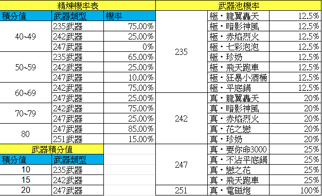 1.消耗任意四把247數值~230數值內的武器即可精煉出一把新武器,消耗的武器品質越高,精煉出高品質武器的機率越大